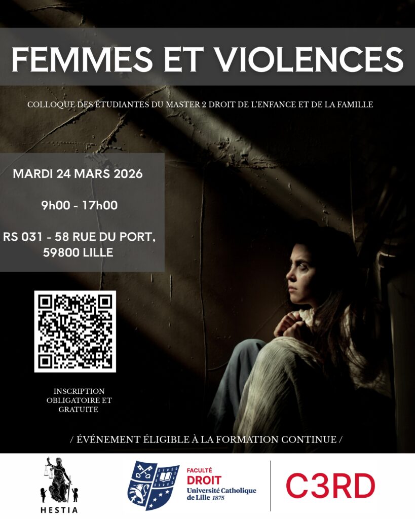 Les étudiantes du Master droit de l’Enfance et famille de l’Université catholique de Lille et leur association Hestia organisent un colloque sur le sujet suivant : « Femmes et Violences », qui se déroulera le 24 mars 2026 de 9h à 17h en RS 031. Au cours de cette journée, seront abordés notamment les mécanismes juridiques de protection des femmes victimes de violences, tant dans le cadre familial qu’en dehors de celui-ci, avant d’envisager les situations dans lesquelles des femmes peuvent elles-mêmes être auteures de violences.